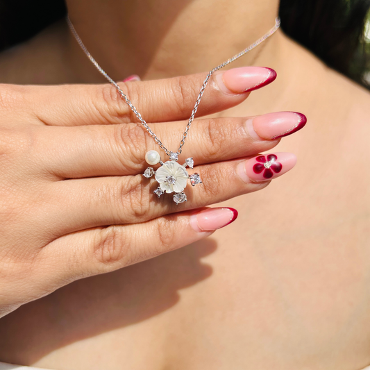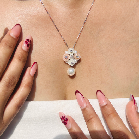 This pendant set blends vibrant color and whimsical garden beauty, designed for those who adore creative and standout jewelry. Crafted in 925 silver, it is hypoallergenic and anti-tarnish, ensuring comfort and durability for everyday wear. A significant portion of recycled silver has been used, reflecting a thoughtful commitment to sustainable luxury. Pastel peach flowers, shimmering silver blossoms, sparkling stones, and bold red accents make this set perfect for gifting or bold personal style.